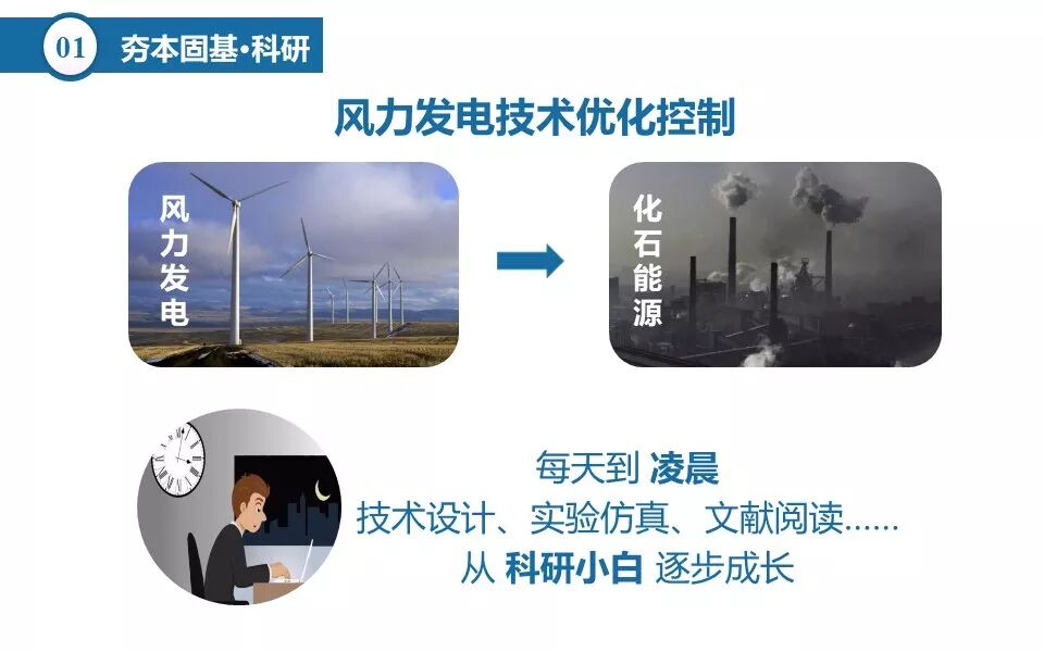 我的研究课题是风力发电技术优化控制,通过发展风能等可再生能源对缓解化石能源的重污染等问题有重要研究意义,在实验室三年时间里,我从一个科研小白逐步成长,每天到凌晨的文献阅读、技术设计、仿真实验更是习以为常,但收获成果是幸福的。