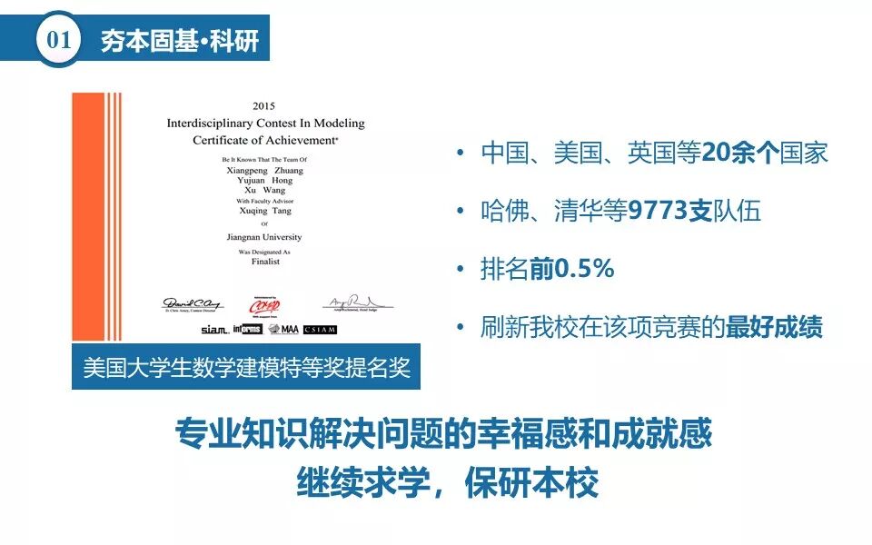 我曾参加美国大学生数学建模比赛,在20余个国家9700多支参赛队伍中排名前0.5%,刷新了我校在该项竞赛的最好成绩,也在那时候,我感受到了用专业知识去解决问题的幸福和成就感,也坚定了我继续深造的信念。在大四顺利保研,进入纪志成教授团队。